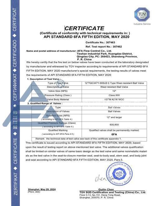 API 6FA防火证书是石油天然气行业阀门防火性能的重要认证,要求阀门在火灾等极端情况下仍能保持一定的密封性能,阻止火势蔓延,保障人员安全。AFA一直非常重视产品质量和技术创新,此次API 6FA证书的获得,标志着公司在阀门防火性能方面的技术实力得到了行业的高度认可,也印证了我司上装C型耐磨球阀在各类严苛工况下的适应性。
